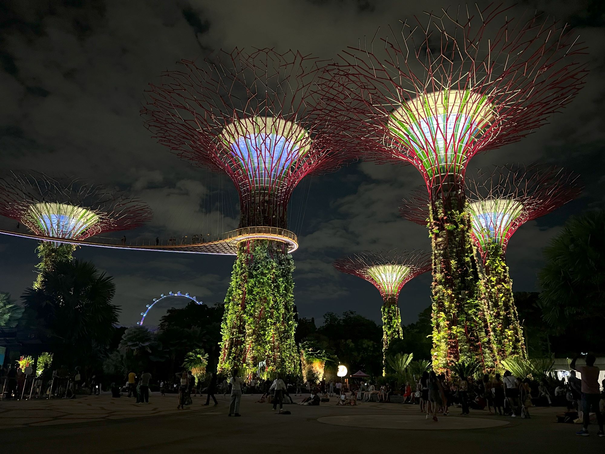 Nach einem kurzen Essen in einem Foodmarkt liefen wir wieder zum Gardens by the Bay, in dem wir die erleuchteten Super Trees und um 20:45 Uhr die tägliche Lichtshow genossen. Wie wunderschön und aufwendig die gesamte Innenstadt um die Marina Bay erleuchtet ist. Um Mitternacht fielen wir nach über 18 km Fußmarsch und einem langen Tag voller Eindrücke müde ins Bett.